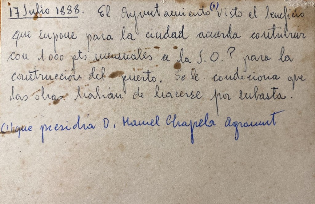 El ayuntamiento, que presidía don Manuel Chapela Agramunt, visto el beneficio que supone para la ciudad, acuerda contribuir con 1000 pesetas mensuales a la J.O.P para la construcción del puerto. Se le condiciona que las obras habían de hacerse por subasta.